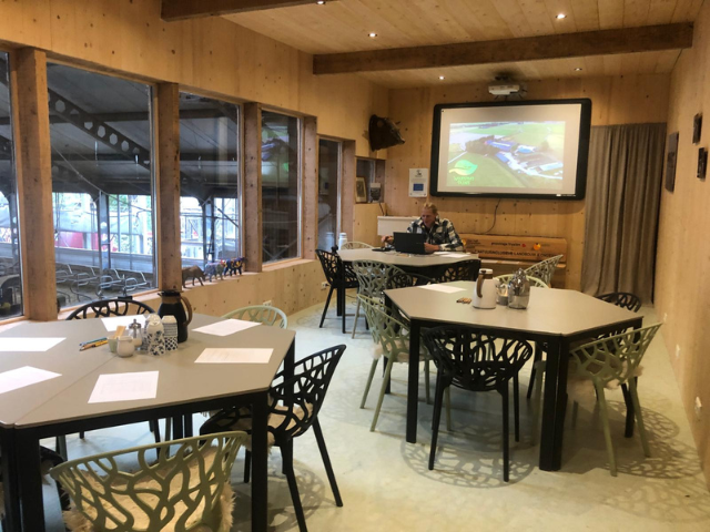 't Pleatslokaal is uitgerust met alles wat je nodig hebt: een digiboard met beamer, interactieve mogelijkheden, comfortabele tafels en stoelen, een bar, koffieautomaat, koelkast en toilet. Sfeervol en met een unieke inkijk in onze werkwijze.